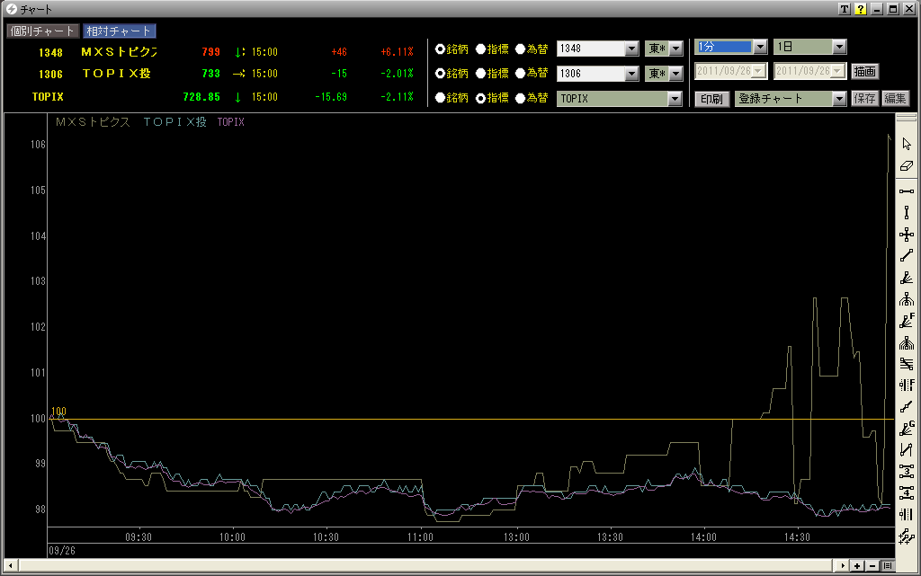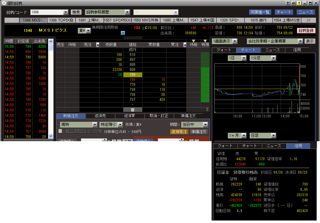 後場、時間が経つにつれ、MAXIS-TOPIX-ETF(1348)の価格が明らかにおかしくなり、大引けにかけてとんでもない大暴騰に至りました。