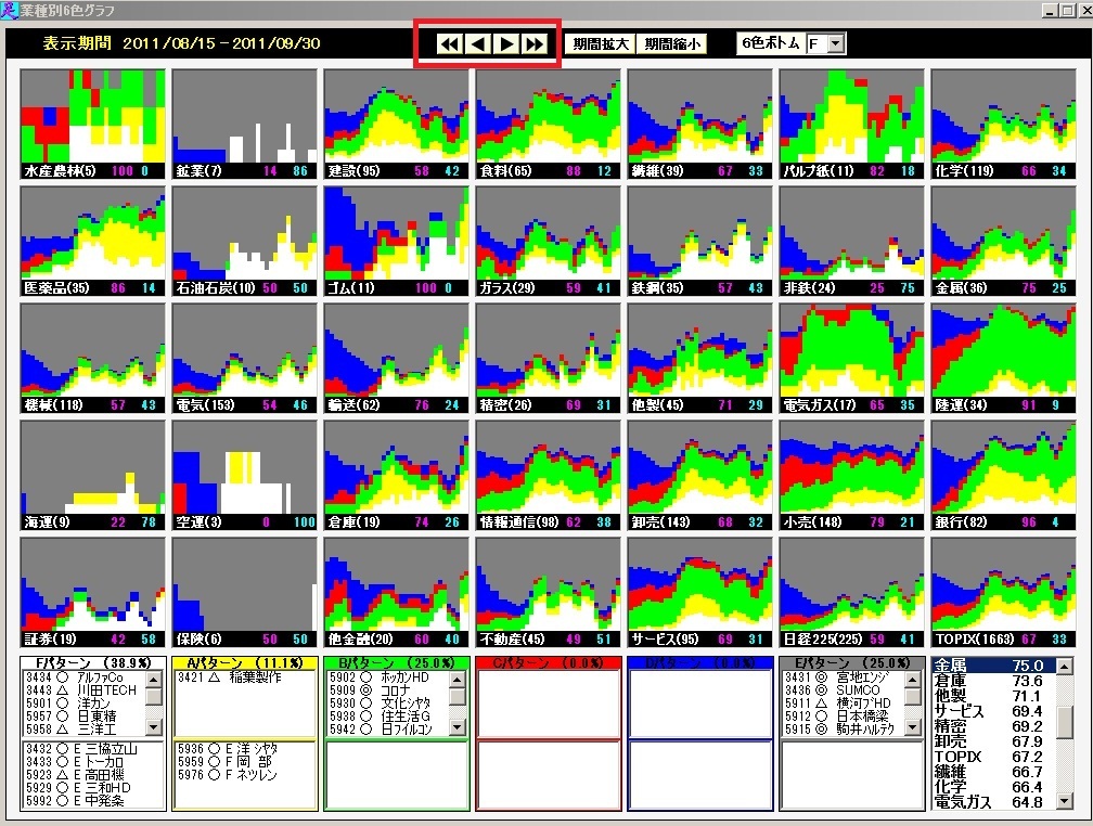 一番右側の色で黄色、緑の面積が多い業種は強く、黒が多い業種は弱いと判断できます。