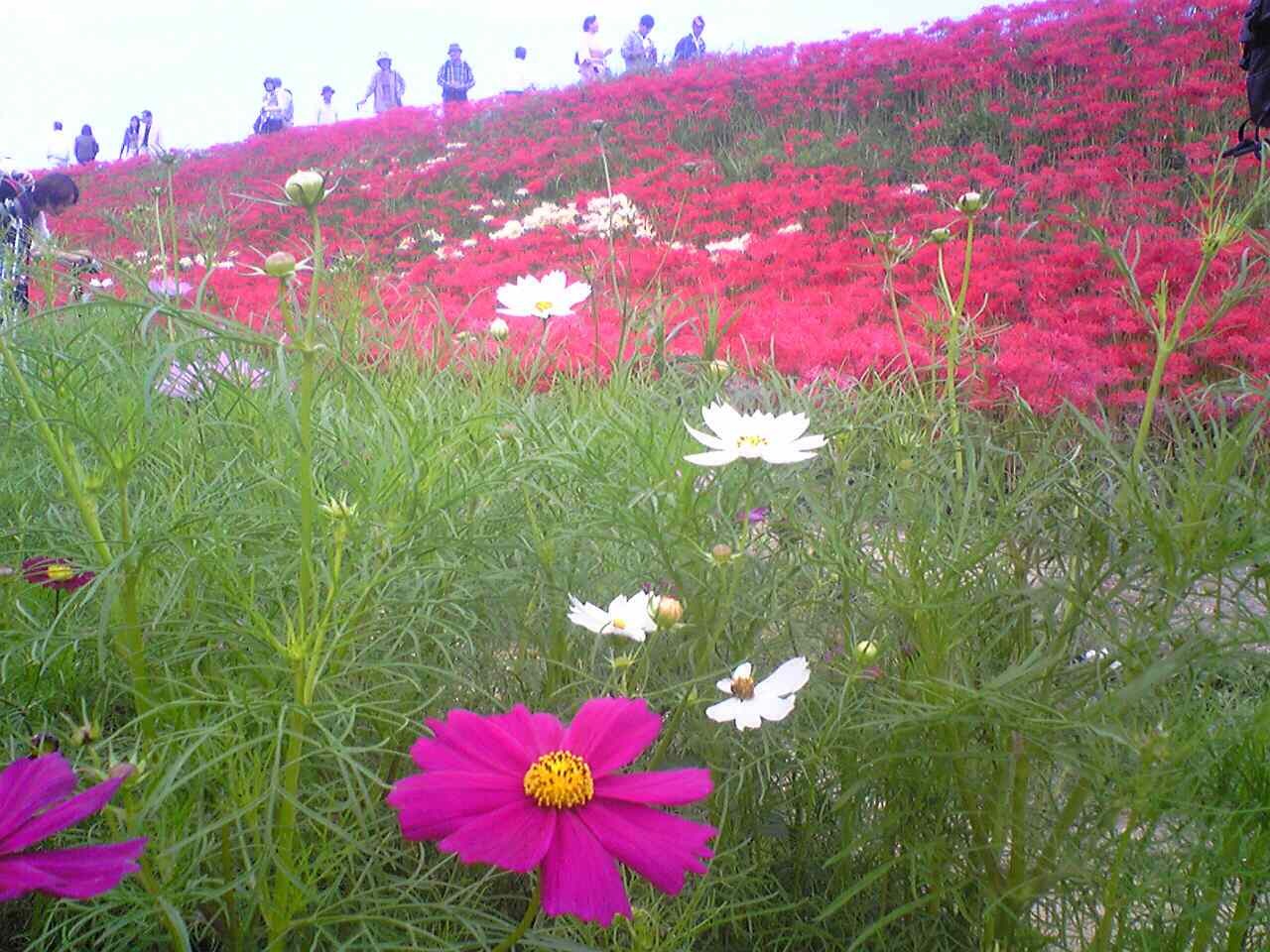 真っ赤なヒガンバナの中に白い花も混じっていますね。