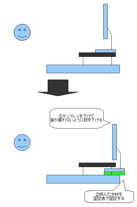 ★机上台から画面をおろす代わりに間に厚めの板を挟むことでディプレイを見やすくする