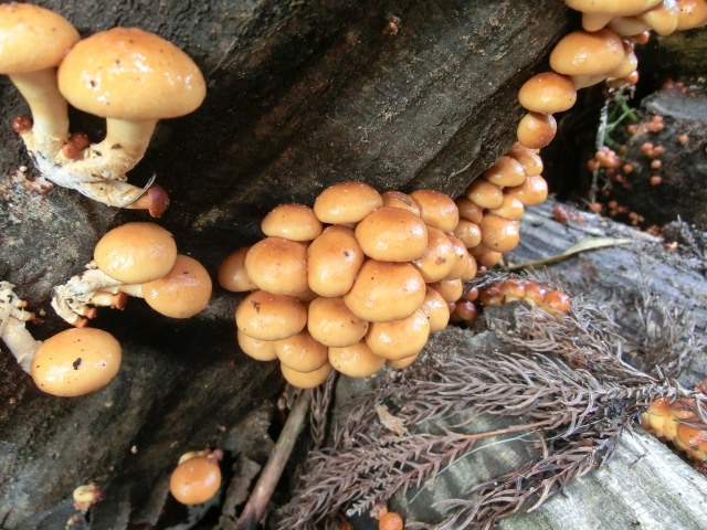 今日の山歩きは、ナメコ、ナラタケ、ウラベニホテイシメジ、杉平茸、ヌメリスギタケ