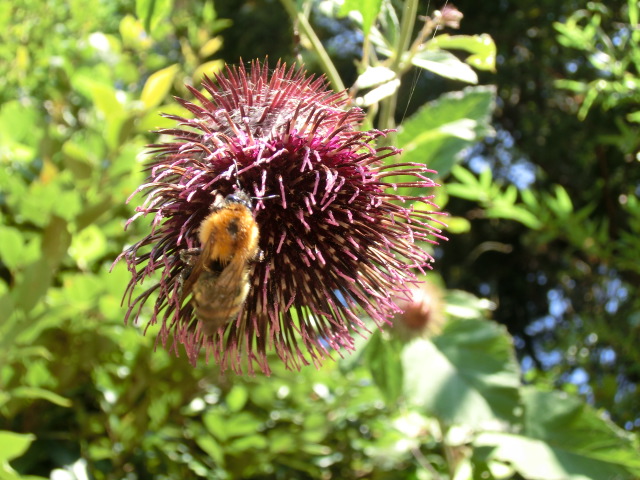 オヤマボクチ 雄山火口 は今が花の最盛期で蜂が忙しく蜜を集めてます