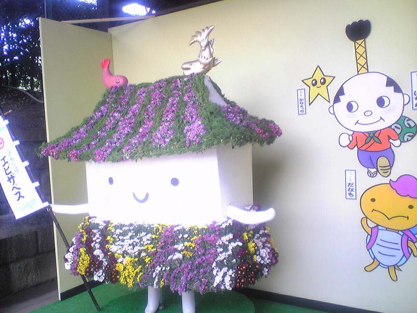 お城の修復や菊職人の減少で年々面積が減ります。エビザベスの人形には子供達が反応。