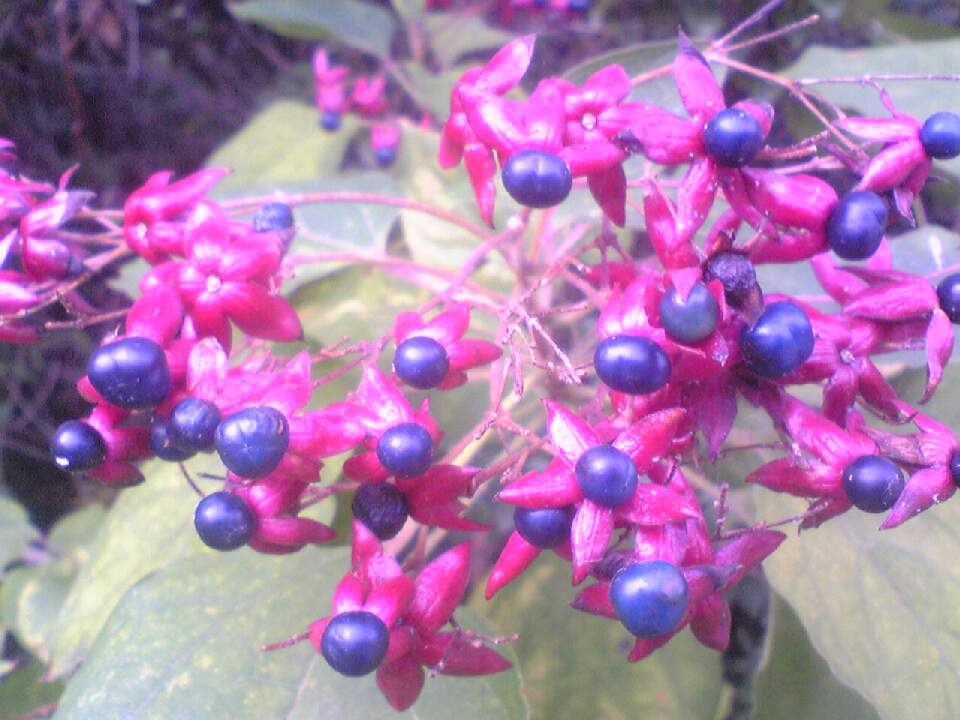 色々な実があります。今年は気候が変で、花も同時に見られました。どっちも綺麗な青い実で、有用なようですね。