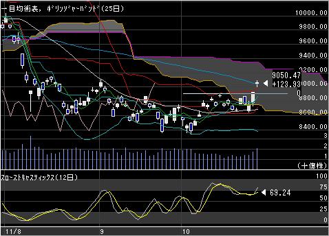金曜日には前回高値を更新しボリバンを上回りましたが十字足。出来高もありました。