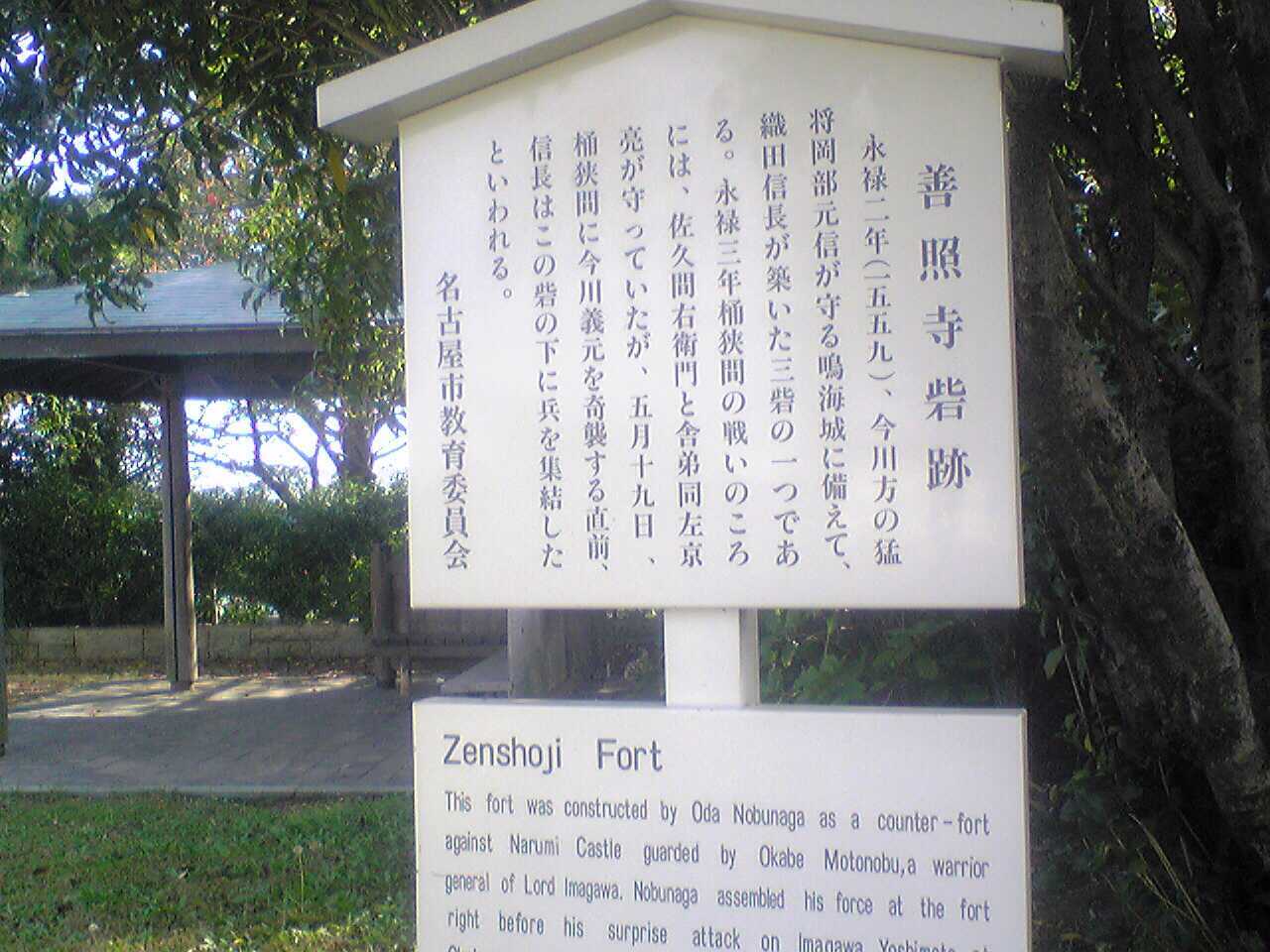 善照寺砦(ぜんしょうじとりで)は、今川義元との戦いの際に織田信長が鳴海城を囲むように築いた三砦の一つ。 1559年(永禄2年)鳴海城は南の大高城とともに今川義元直属の支配下となった。鳴海城から徒歩で約5分の近さにある。 東西60メートル、南北36メートルの平城。 佐久間右京亮が守っていた。 桶狭間の戦いではここの下に織田信長が軍を集結し、桶狭間の戦いに備えていて、今川軍の動向を見てここから出陣した。確かに、桶狭間の方角は良く見える位置である。砦の下の街道は良く踏み固められており、雨でも余りぬかるむことはなかったか?雨や霧で見つからないことを承知で進軍したのであろう。