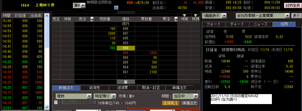 本日15:00の 上場MSCI世界株(1554)の推定NAVは829円。