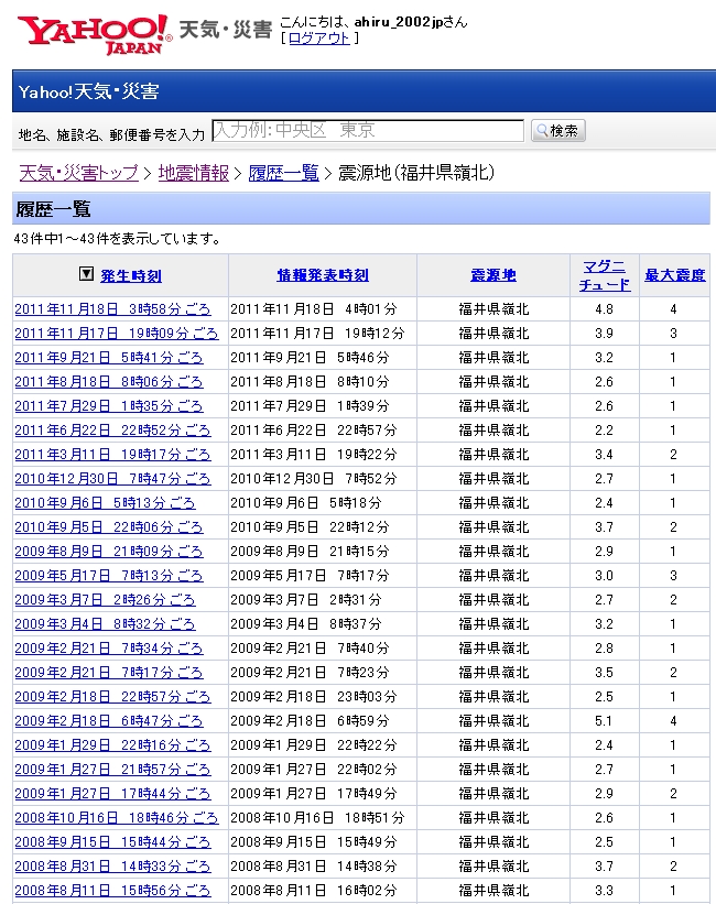天気・災害トップ > 地震情報 > 履歴一覧 > 震源地(福井県嶺北)