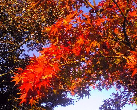 お母さんがお抹茶が好きで、飲んでいると赤ちゃんまでお抹茶を飲むようになるようです。出されたお抹茶に口を近付け口いっぱい緑色にして、飲んだそうです。ちょうど、4人のお子さんがいる家族にもお母さんにぶら下がっていた子がお抹茶をおいしそうに飲んでいて、ビックリさせられました。刺激物が多くコーヒーやお抹茶などは余り飲ませないほうがいいといわれていましたが、これを見ると、新人類。将来お抹茶の道に進むのではと思います。紅葉も半分ぐらい進んで、真っ赤に染まった木もありました。