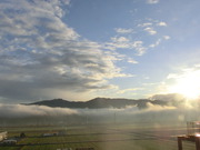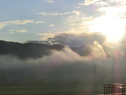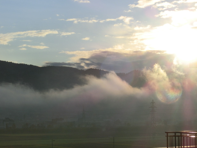 川霧が朝陽に輝いてゆっくり流れて行きます・・・・・