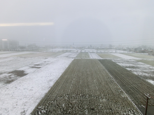 上段の広い畑の雪景色、中程の黒い所は滑走路かと。「福井空港」あったかな。