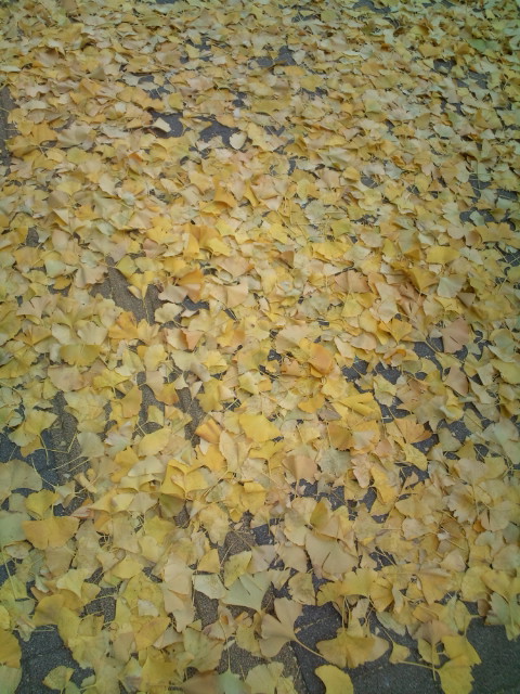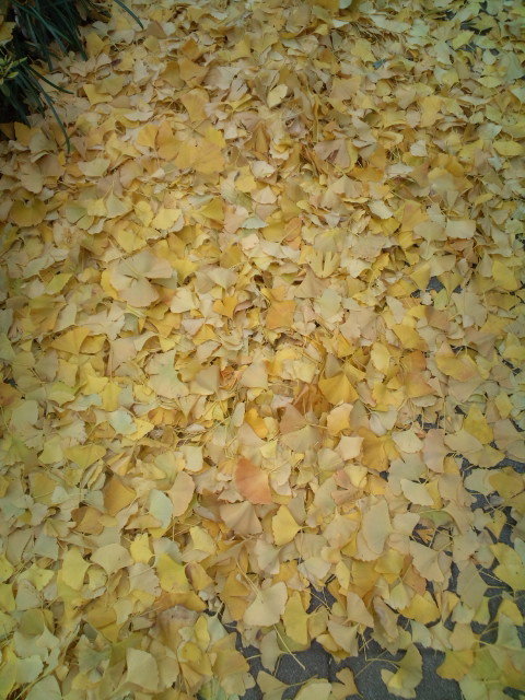 掃き掃除されていない歩道では、写真のようにいちょうの葉っぱでじゅうたんのようになっていました。