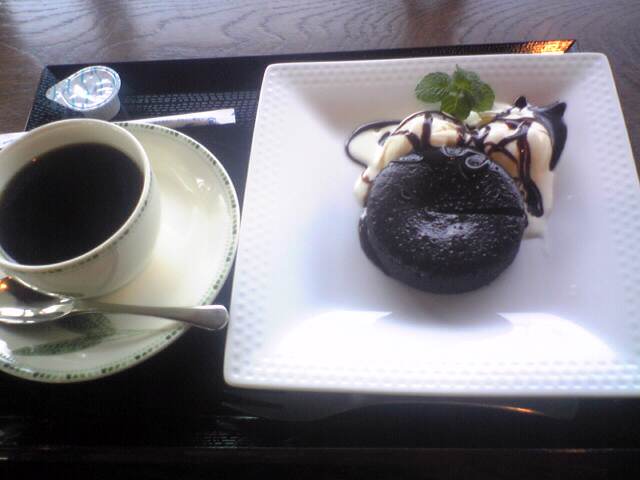 日が暮れるまで、喫茶でブラウニーとアイスクリームにチョコソースとコーヒーでしばし休憩。暮れ行く日を眺める。