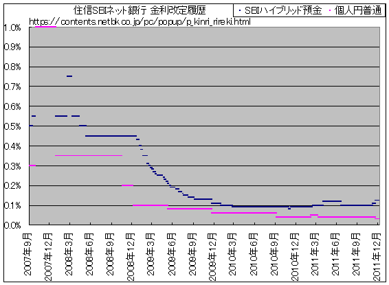 住信SBIネット銀行の、SBIハイブリッド預金 及び 個人円普通金利の改定履歴をグラフにしました。