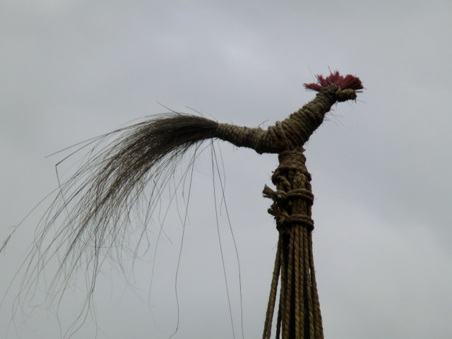 この、稲わらで作った鶏の飾りは庭師さんが樹木を雪の重みから枝を守るための雪吊りの頂上部分に1つだけ作る縁起飾りです