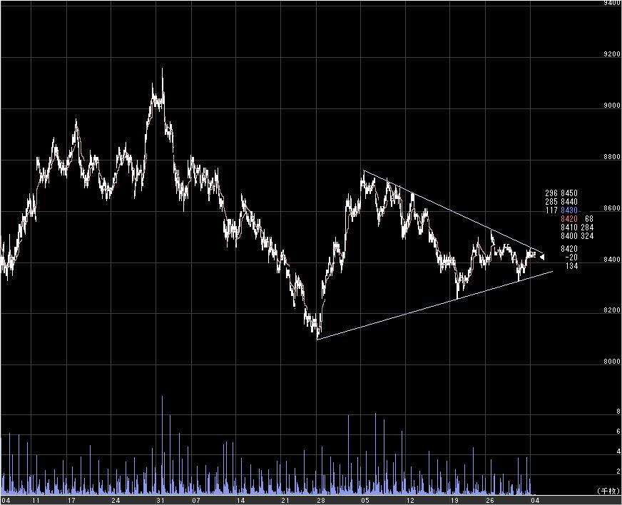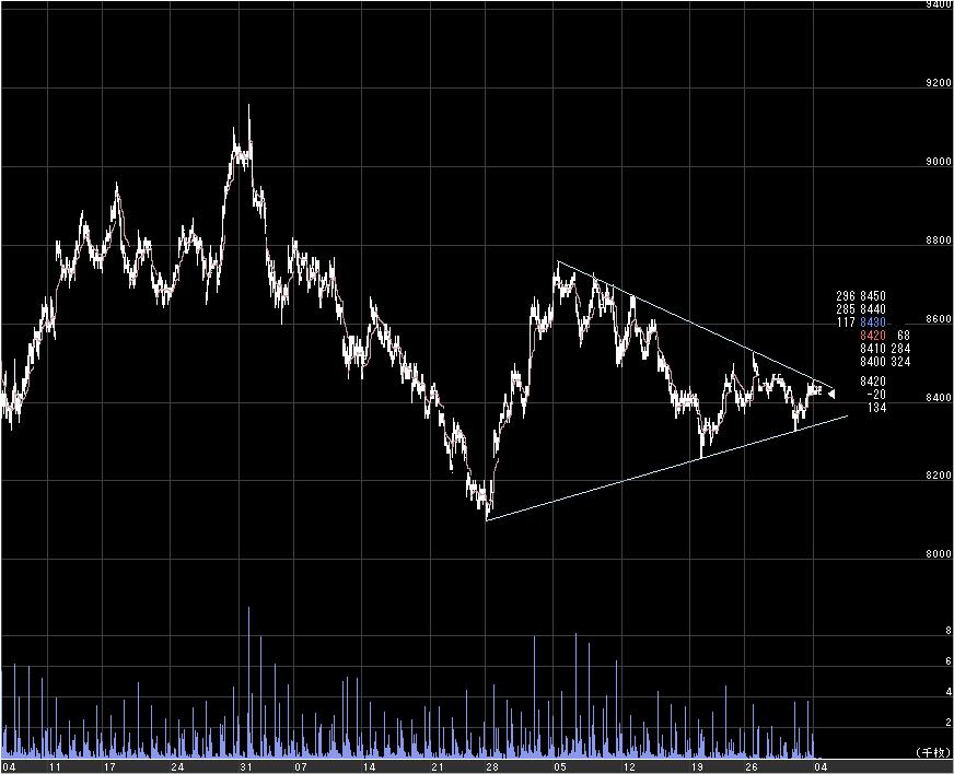 現在は保ちあいで日経平均は上抜けたように見えますが先物では上値抵抗線を抜けてません。(SS参照)