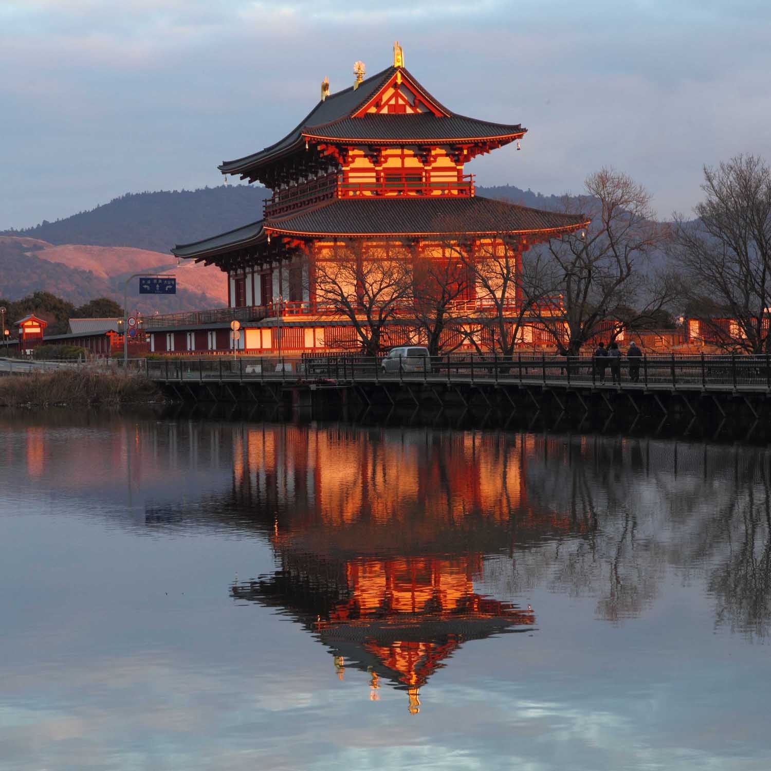 夕日を浴びた大極殿を水面の反映で捉えました。