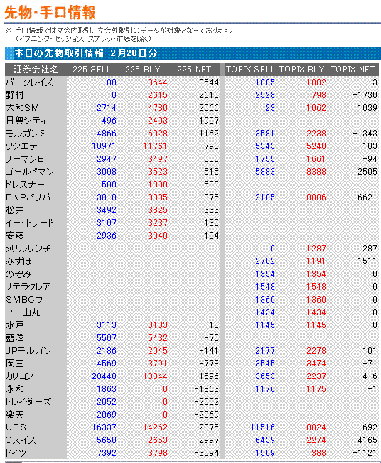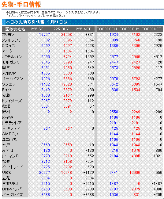 こんばんは。先物手口は、クレディスイス、UBS、カリヨンは短期でバタバタと売買することが多いですね。たいした理由も無いのに大幅安の日は、手口を見るとこれらの証券会社からの売り手口が目立つことがよくあります。その場合、翌日に彼らが買い戻してくれてリバることが結構ありますね。