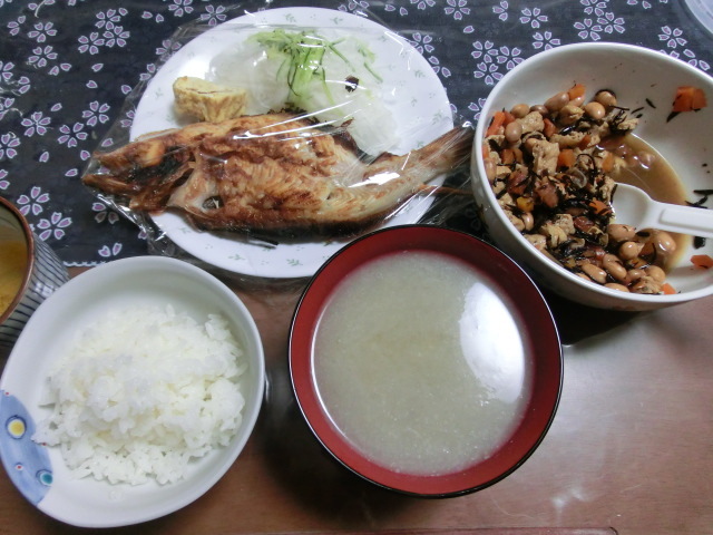 焼きカレイ+ダイコンサラダ+煮豆(福井風なのでアブラアゲ入り^^;)+レンコンおろしの味噌汁(富山風)