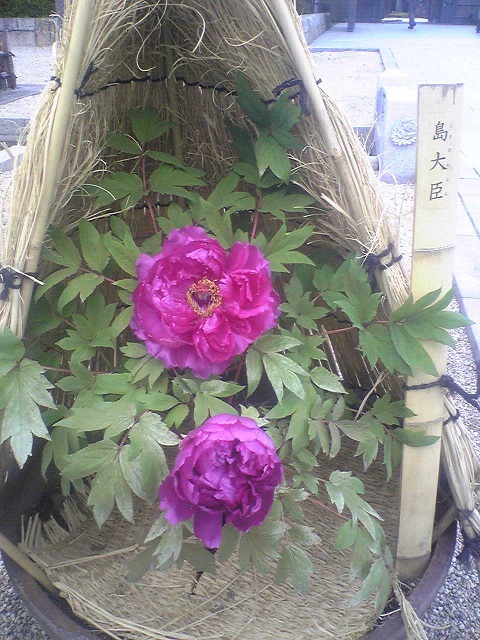 我が家には、数年前に島根県の大根島を旅行したときに買った白と赤の牡丹が二株ありますが、ほったらかしなのでたまにしか花をつけません。牡丹の花は、雨に弱いので咲いたらすぐにちょん切って花瓶に挿しています。藁で囲いをするといいのですが、底まで熱心ではない私です。今年の春は、果たして咲いてくれるでしょうか。もっと愛情をかけないとダメですね。(反省)
