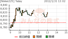 円高、海外安、ドル安、で寄りつき安値8780円から、持ち直して午前を終えた。