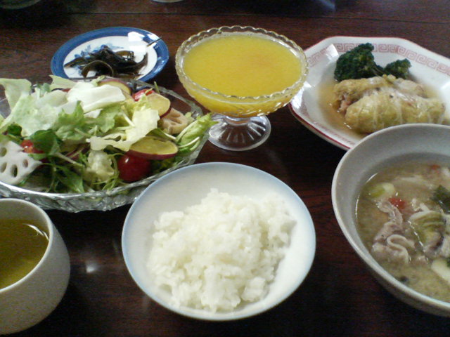 生野菜と温野菜のサラダ,豚汁,エビと玉葱の白菜包み,みかんゼリーになり損ねたみかんジュース。