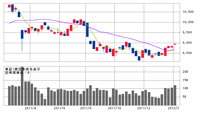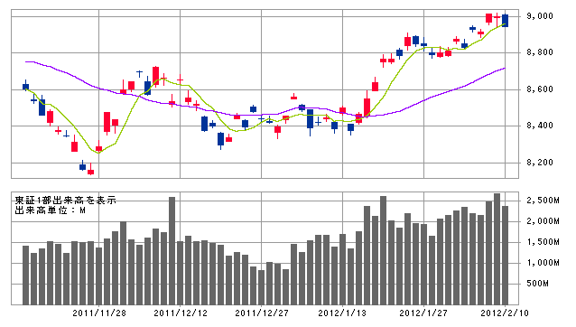 ただ、昨日の日記で述べた日足に続いて、週足も13週線が26週線を上抜ける長期GCの様相を呈しており、調整が日経¥8,600あたりで済むようならば、押し目買いの好機となるやもしれませぬ。