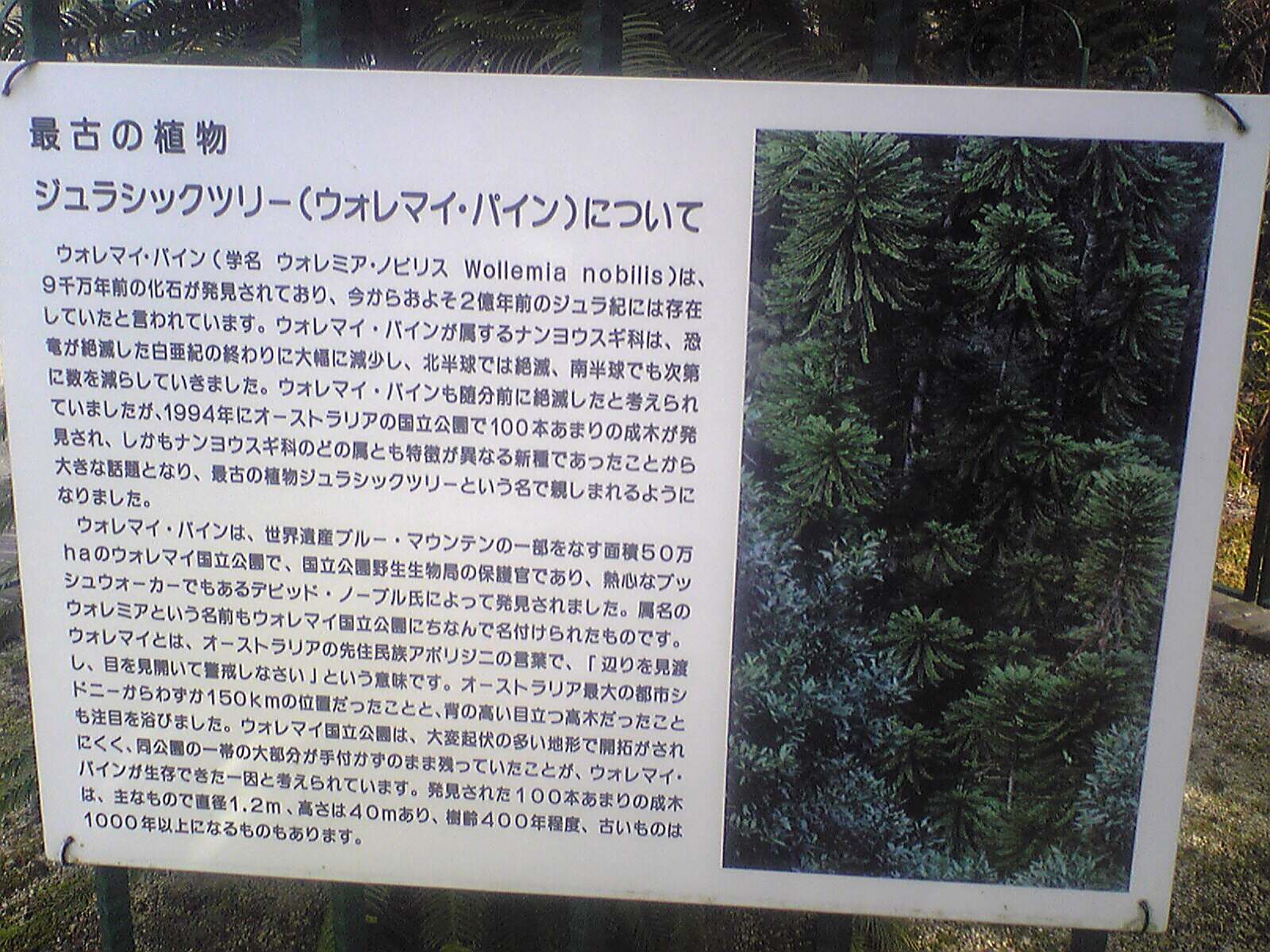 とても興味深く拝見し、居ながらにして東山植物園の”2億年のタイムスリップ”の興奮を覚えました。シーラカンスといいウォレマイ・パインといい自然界には万古不変不滅のものがあるんですね。ありがとうございました。