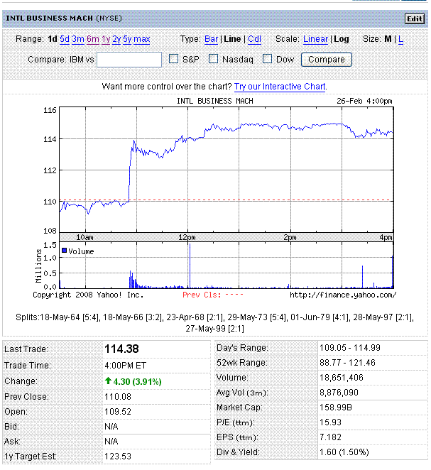 消費者信頼感指数は予想を下回る低水準(⇒個人消費減)、生産者物価指数は予想を上回る高水準(⇒インフレ懸念)と、経済指標はネガティブなものでしたが、IBMが自社株買いを発表し、大手企業は信用収縮にもかかわらずキャッシュリッチで体力があるとの見方が広がり、株価指数は大幅続伸。それと単純に、IBMは値嵩株なのでダウへの指数寄与度が大きいです(ダウは日経平均と同じ株価平均型の指数)。米経済指標からドルが売られ、ユーロは対ドルで最高値を更新。原油価格(WTI)は101ドルまで上昇。
