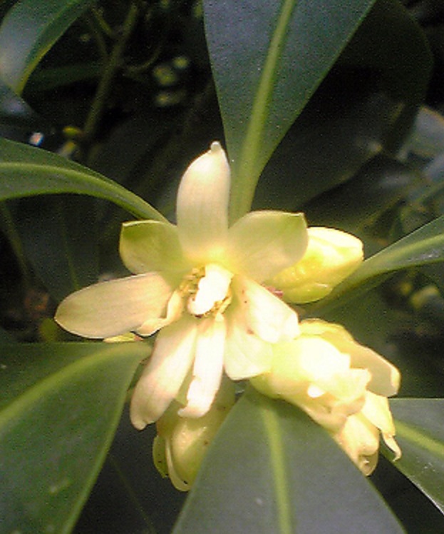 トウシキミ(ダイウイキョウ、八角)は真中が赤い丸い花です。実は八角です。