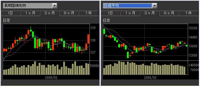 米株安と円高進行を受け大幅反落。金融株や値嵩ハイテクの下げが大きかったです。東証一部出来高は19.8億株、売買代金は2.4兆円と、下げ幅の割には低調でした。ドル円や長期国債の位置を考えると、昨日、今日の日経平均の下げ幅はおとなしい感じもします。長期国債は、2月上旬の日経平均13000円付近だった頃の値をぶち抜いています。長期国債が買われすぎなら、来週は長期国債先物売り・株先物買いの圧力がかかる可能性がありますね。