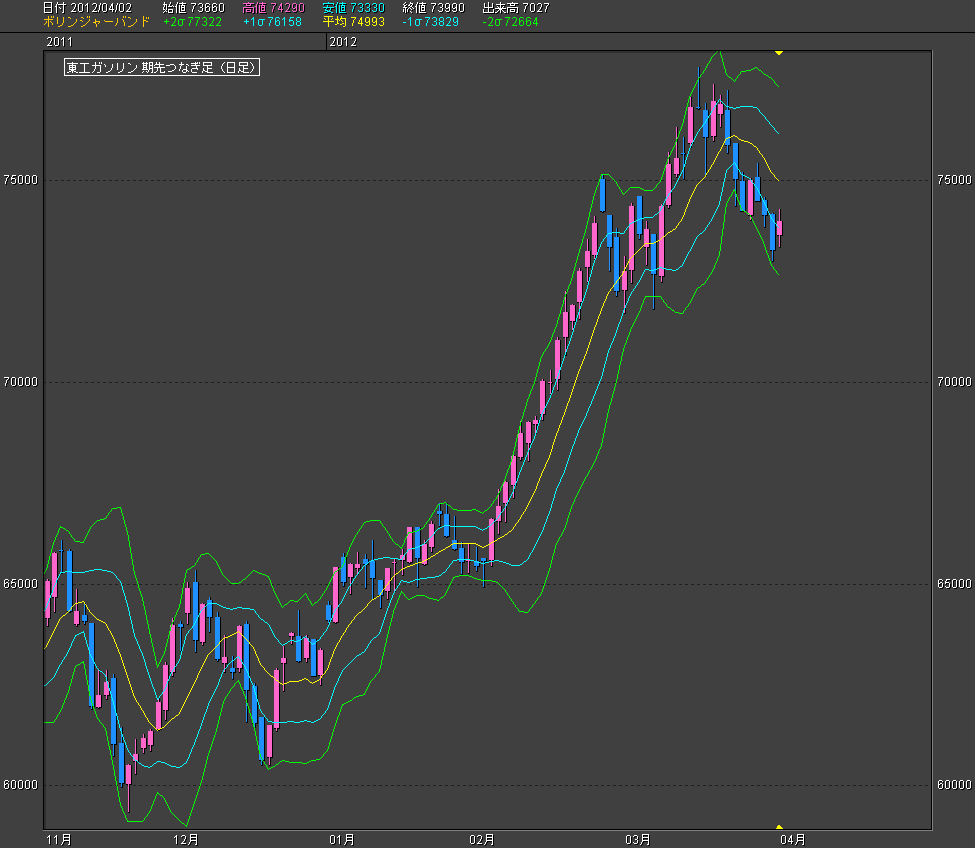本日(2日)の終値ベースでバンド-1を上回ったのが確認できる。しかしバンドの方向性から判断し、終値ベースでバンド±0を上回らない限り戻り売りの展開が継続すると思われる。