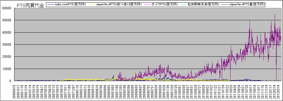 JapanNextPTSの昼間の取引が売買代金を着実に伸ばしていますが、その他のPTSは悲惨です。