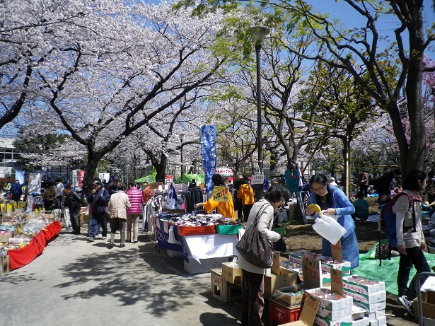 途中の公園でお祭りをやってました。桜も満開です。