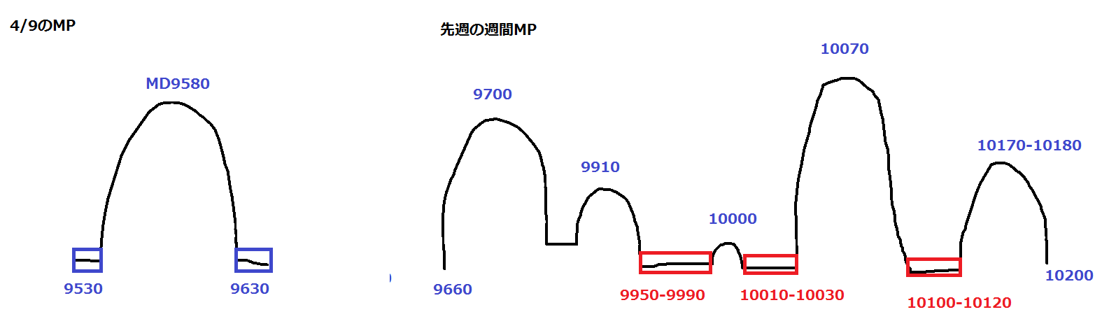 下値めどは計算値が9460、9400~9200には下値支持ラインがたくさんありますので、