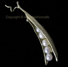 写真一番右はさやえんどうを真珠で作ったブローチ。ティファニーにアンティーなさやえんどうのブローチがあるらしいけれど、それは白い真珠と金だ。