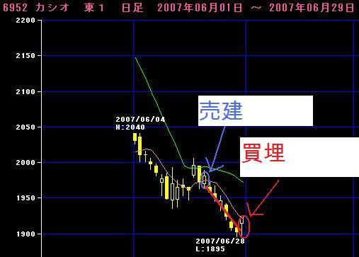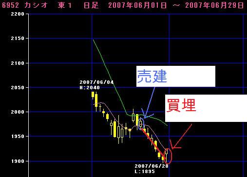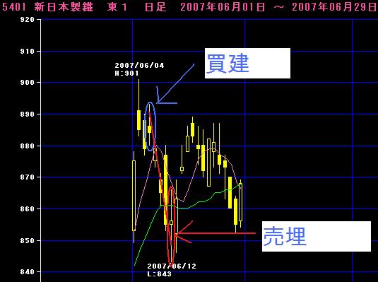 右図は新日鉄の取引ですが、逆指値を怠ったため6月12日に848円で返済することになりました。