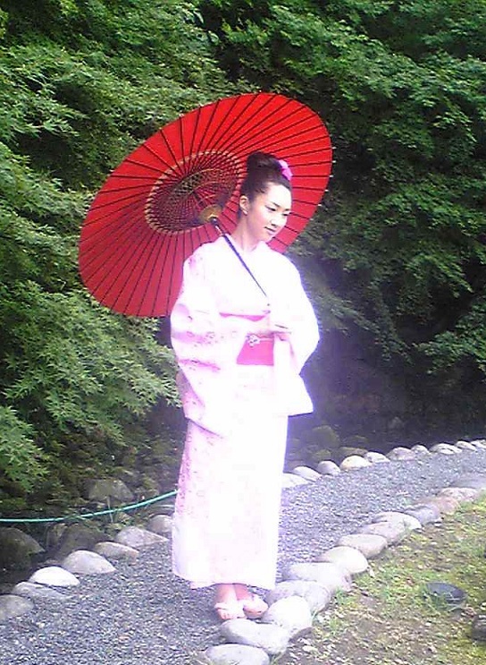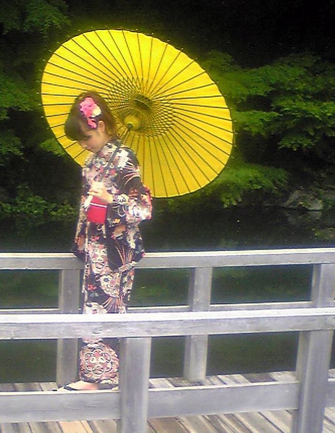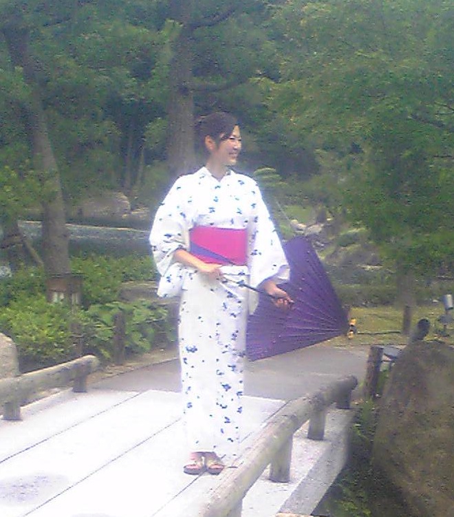 徳川園に行ったら、モデルさんがいました。和傘と花しょうぶが似合います。