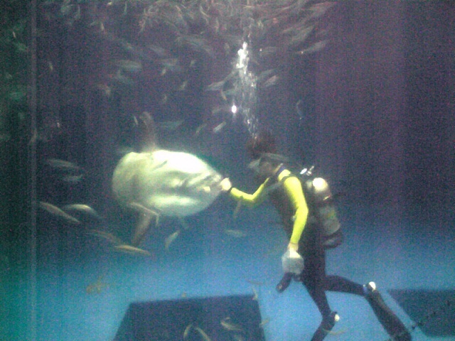 マンボウに餌やりしているところ。のんびりしてるのでほかの魚に食べられてしまいます。こうやって、手渡しするとは。名古屋港水族館