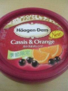 このカシスオレンジ、中にオレンジの粒の皮が入ってます。フレッシュ感があるアイスで、おいしいです☆みずみずしい味。というのが正しいのかな。