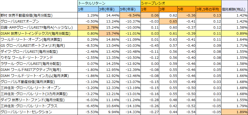 そして、それらのリターン、シャープレシオ、信託報酬を集めた。