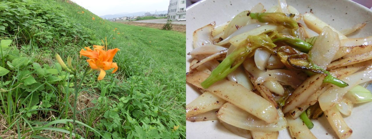玉ねぎざく切りとカンゾウの蕾をあわせてざっくり炒めます