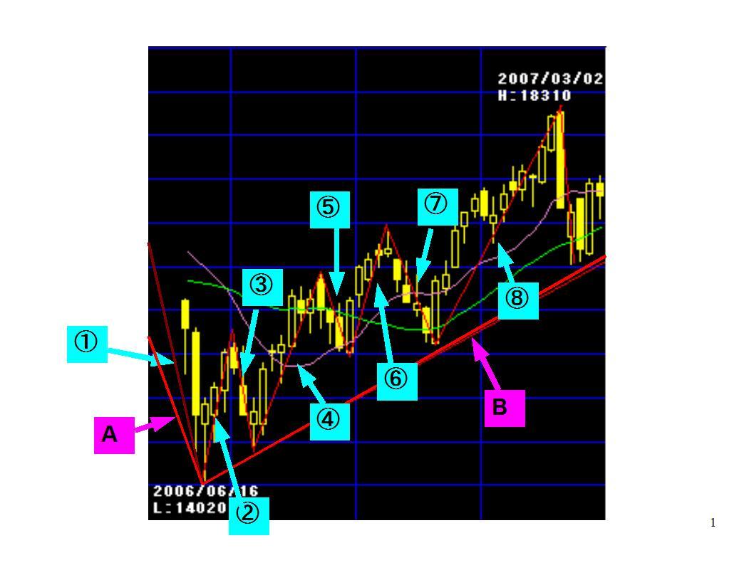 中期で見ている人にとって図のAとBがメインのトレンドを示すラインであって、①、②、③といった小さなラインはトレンドラインではないのです。