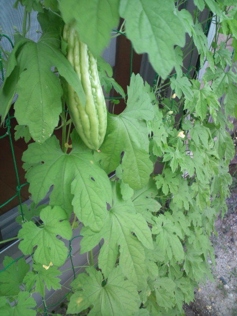 3年ほど前に種から育てて10近い苗ができ、ゴーヤも小さいのがとれ過ぎたことを反省して、今年は2鉢だけ苗を買って育てました。