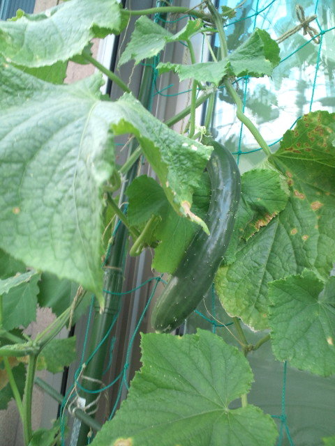 キュウリはゴーヤのようにいくつもの枝分かれをするわけではないので、グリーンカーテンにするには目がちょっと粗いです。
