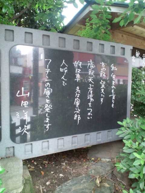 そこから柴又帝釈天に向かうため参道を歩いていると、おなじみのセリフの石碑がありました。