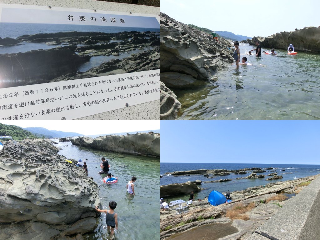 越前海岸の小丹生(こにゅう)という海岸は 「弁慶の洗濯岩」 と呼ばれ、弁慶と源義経が北陸道を北上したときにここで休んで洗濯をした場所といわれるところです