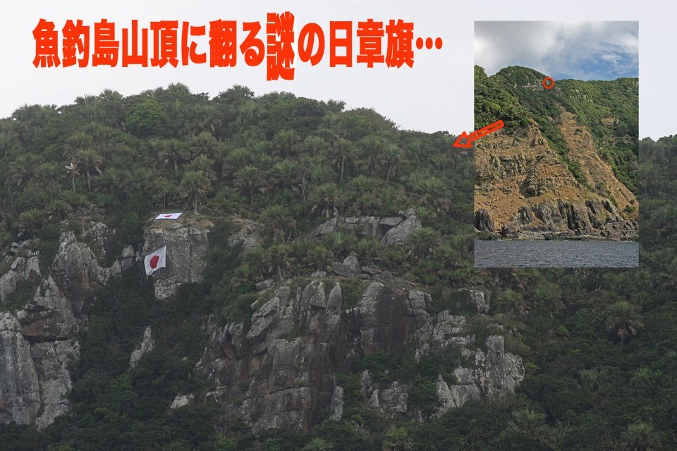 魚釣島の奈良原岳(362m)の山頂付近に翻る2つの日の丸旗。いったい誰がやったのか?