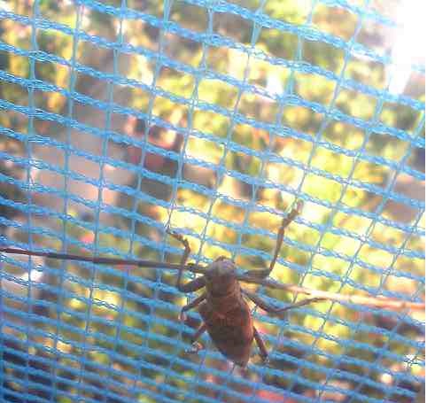 先日、夏の日に木が枯れましたが、からした張本人のカミキリムシと思われる虫が風きりネットにぶら下がっていました。