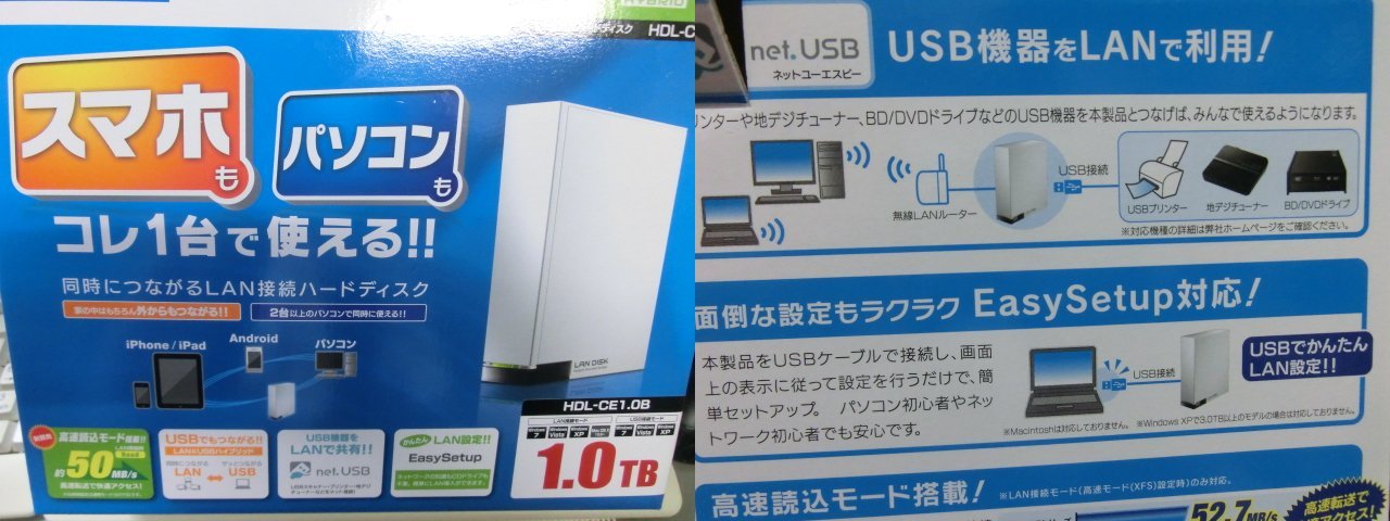 特に、 I・Oデータの HDL-CE シリーズは LAN-DISK と USB-HDD を切り替えて使えるうえに、